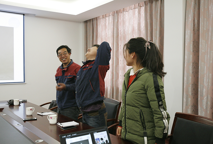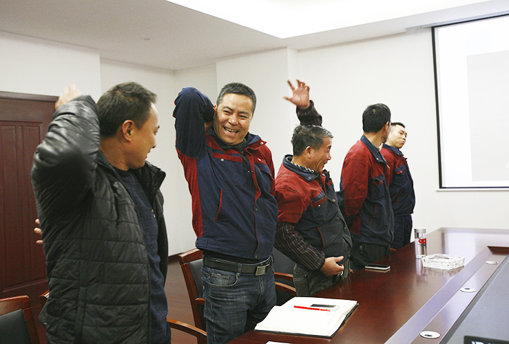 职工们纷纷通过自我拉伸检测是否有潜在肩颈疾病